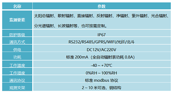 太陽輻射是氣象觀測指標中重要內容,根據氣象組織WMO標準要求,太陽輻射標準觀測分為:總輻射、散射輻射、直接輻射、反射輻射、凈全輻射,太陽光譜輻射(紫外光、可見光,近紅外光,遠紅外光)