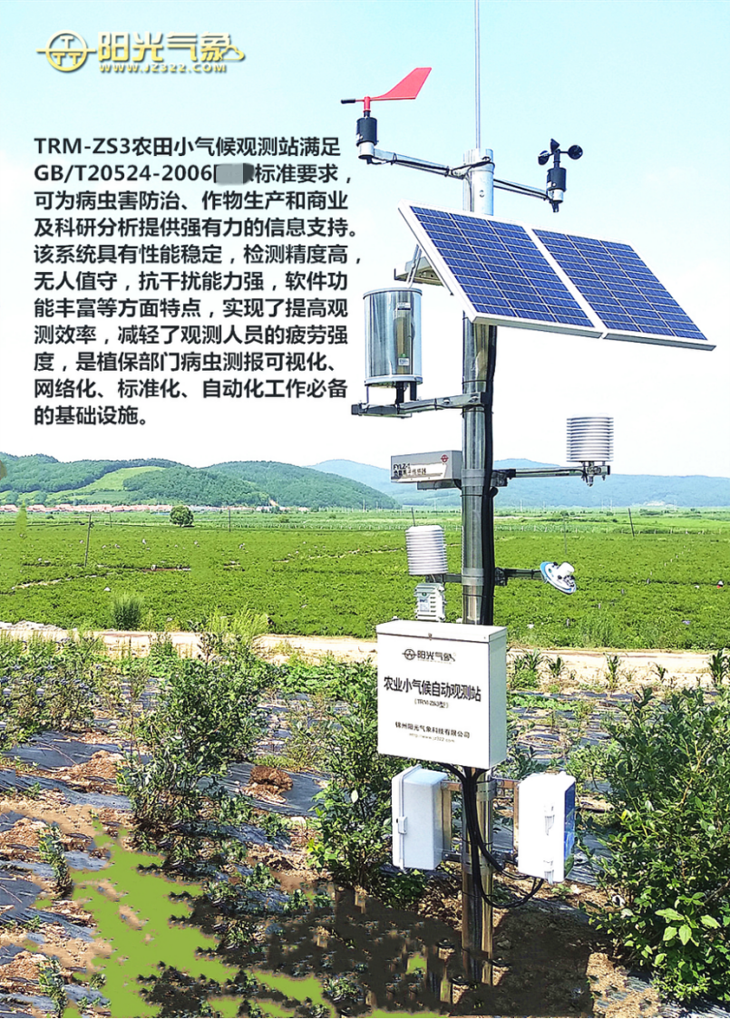 TRM-ZS3農田小氣候觀測站滿足GB/T 20524-2006標準要求,可為病蟲害防治、作物生產和商業及科研分析提供強有力的信息支持。該系統具有性能穩定,檢測精度高,無人職守,抗干擾能力強,軟件功能豐富等方面特點,實現了提高觀測效率,減輕觀測人員的勞動強度,是植保部門病蟲測報可視化、網絡化、標準化、自動化工作必備的基礎設施。