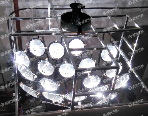 1.1 TRM-PD1H型聚光式太陽模擬發射器(矩陣式)是錦州陽光科技發展有限公司根據多年太陽模擬器生產經驗開發的矩陣式模擬光源(稱人造太陽),專用于太陽能產品室內測試的實驗設備。TRM-PD1H型聚光式太陽模擬發射器(矩陣式)具有操作簡單、使用方便,安全可靠的特點。模擬器光源采用(20)組獨立的聚光點光源,組成矩陣式結構,光源的個數、位置、光強都靈活可調,以保證有效輻照面積內的光均勻性和穩定性。采用主機現場與微機網絡聯合定時控制功能,可以手動或自動啟動光源,定時控制發光時間,為保證光源質量,用太陽輻射儀實時監測光源的輻射及亮度,由于氙燈照射溫度較高,設有測溫報警及電氣漏電保護裝置以保證系統的安全。該產品適用于檢測中心,科研機構,太陽能產品生產廠家等單位。