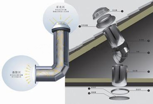 作為一種無電照明系統,導光管照明系統是通過室外的采光裝置捕獲室外的日光,并將其導入系統內部,然后經過導光管裝置強化并高效傳輸后,由漫射器將自然光均勻導入室內需要光線的任何地方。從黎明到黃昏,甚至是陰天或雨天,該照明系統導入室內的光線仍然十分充足。該裝置主要由三部分組成:室外屋頂的采光裝置、導光管傳輸部分、室內頂部的漫射器。