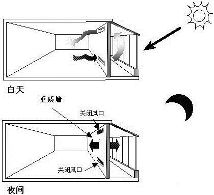 特朗伯集熱墻是一種依靠墻體獨特的構造設計,無機械動力、無傳統能源消耗、僅僅依靠被動式收集太陽能為建筑供暖的集熱墻體。它由法國太陽能實驗室主任FelixTrombe教授及其合作者首先提出并實驗成功的,故通稱為Trombewall(特朗伯墻)。特朗伯墻在冬、夏兩季以及白天、夜晚的工作運行原理及要求均有所差別。