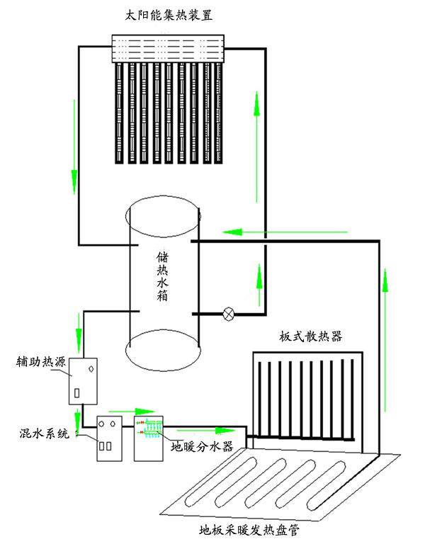 太陽能集熱器采集太陽的能量,把冷水逐漸加熱,儲存在保溫水箱內,待需要取暖時開啟加以利用,把水箱內儲存的熱能通過地暖管路內熱水的循環對室內空間進行釋放熱能,將室內的冷空氣加熱,來提高室內空間的環境溫度。滿足需要。太陽能采暖系統由太陽能集熱器(平板太陽能集熱器、真空管太陽能集熱器、U型管太陽能集熱器、熱管太陽能集熱器)、水箱、連接管道、控制系統等輔材構成。將分散的太陽能通過集熱器,把太陽能轉換成熱水,將熱水儲存在水箱內,然后通過熱水輸送到地暖管路,提供建筑供熱的需求。