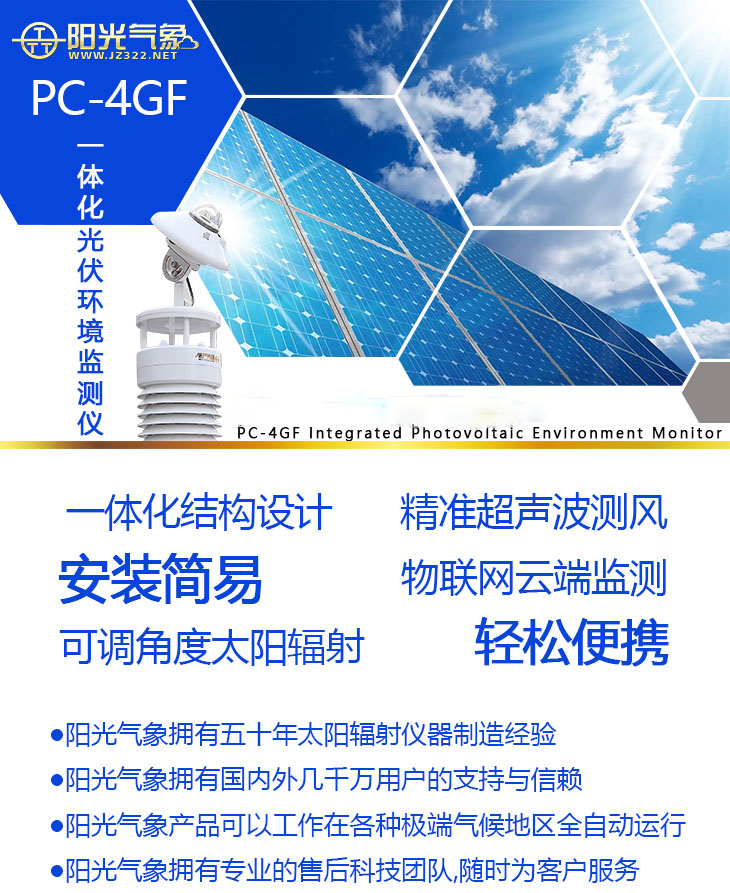 本產品是針對光伏發電站研發生產的一款最新型一體化光伏環境監測儀,該設備采用新型一體化結構設計,測量精度高,安裝使用方便,可采集多種要素:含太陽輻射(水平/斜面)、溫度、濕度、風速、風向、大氣壓力、背板溫度等要素,要素可按需定制。