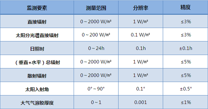 監測10波段太陽直接輻射,太陽總輻射、散射輻射、日照時數、太陽高度角、經度、緯度、海拔高度、大氣氣溶膠厚度、9波段天空光等