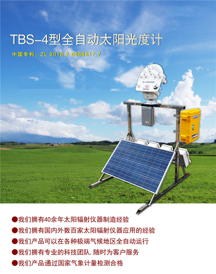 TBS-4全自動太陽光度計為高精度野外太陽和天空輻射測量儀器,不但可以測量十個波段的太陽直接輻射,還可以測量太陽的總輻射、散射輻射、日照時數、太陽高度角、大氣氣溶膠厚度、天空光等諸多要素,并可以通過GPS實時定位追蹤。還具有易攜帶安裝,自動瞄準,太陽能供電,無線組網云端監測,數據自動傳輸等特點。它將機器人控制技術與輻射測量技術完美結合,采用了太陽光追蹤+旋轉角度測量+輻射光譜測量+GPS 衛星定位追蹤等綜合應用技術。它是當今應用最廣、功能最全、權威性最高的太陽光度計儀器。主要用于測量太陽和天空在可見光和近紅外的不同波段、不同方向、不同時間的輻射亮度,來推算大氣氣溶膠、水汽、臭氧等成分的特性。用于大氣環境監測,衛星校正等應用。
