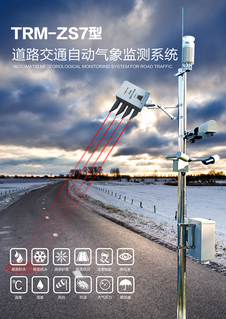 我公司研發生產的TRM-ZS7型道路交通自動氣象監測系統由分布在高速公路沿線的若干個高速公路自動氣象站聯網組成,對高速公路沿線的能見度、風向、風速、氣溫、濕度、雨量、路面狀況(表面溫度、干燥、潮、濕、雪、冰 、冰層厚度、積雪厚度、濕滑程度等)進行自動監測,并將監測信息及時傳送到監控中心,供交通管制系統參考,在惡劣或極端氣象條件下能及時發出警示信息,以多種方式告知管理人員和駕駛員,以提高高速公路的安全行車水平。