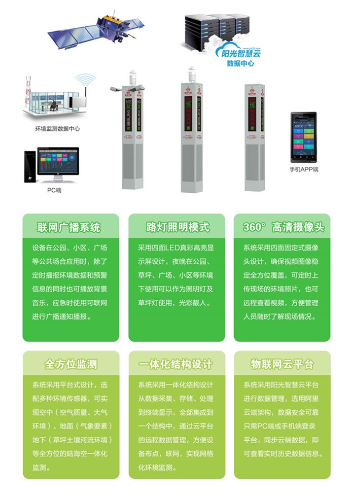 本系統由數據采集器、傳感器、無線傳輸系統、后臺數據處理系統及信息監(jiān)控管理平臺組成。監(jiān)測子站集成了大氣PM2.5、PM10監(jiān)測、環(huán)境溫濕度及風速風向監(jiān)測、噪聲監(jiān)測、負氧離子、有毒有害氣體監(jiān)測(選配)等多種功能;數據平臺是一個互聯網架構的網絡化平臺,具有對各子站的監(jiān)控功能以及對數據的報警處理、記錄、查詢、統計、報表輸出等多種功能。