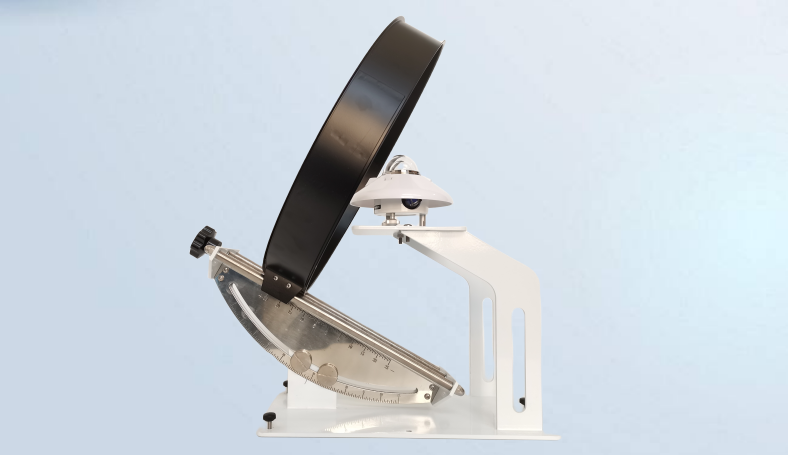 本裝置設(shè)有寬度為65mm,直徑為400mm的遮光環(huán)圈,固定在刻有緯度刻度與赤緯刻度標(biāo)尺的絲桿調(diào)整螺旋上。標(biāo)尺與支架固定在底盤上,根據(jù)架射地點(diǎn)的地理緯度而固定。總輻射表安裝在支架平臺(tái)上,其高度應(yīng)正好使輻射感應(yīng)平面(黑體)位于遮光環(huán)中心。通過調(diào)節(jié)赤緯度,可使遮光環(huán)全天遮住太陽的直接輻射。