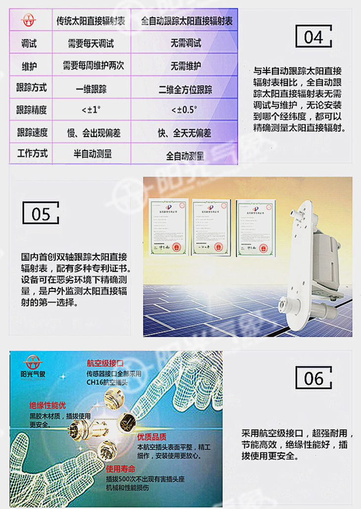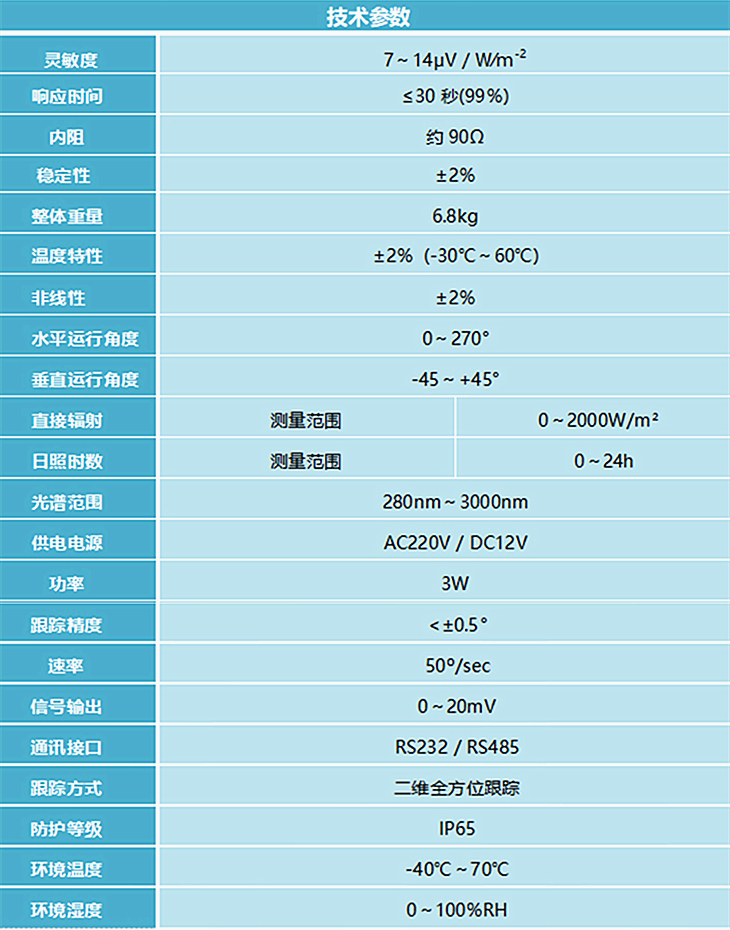 TBS-3全自動跟蹤太陽直接輻射表是國內的無人值守太陽直接輻射表。它人性化的設計理念,使人們對太陽直接輻射的測量不再繁瑣。無需每天的調試,無需不停的維護,你只需要將它安裝在測試場地,就可以精確的測量到每天不同時刻的太陽直接輻射值。