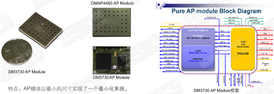 高集成:AM/DM37xx+NAND Flash+LP-DDR+TI PMU;小尺寸:29.5mmx22mmx2.8mm;封裝:LGA封裝,把pin pitch放大到1.0mm,球直徑可達0.5mm;