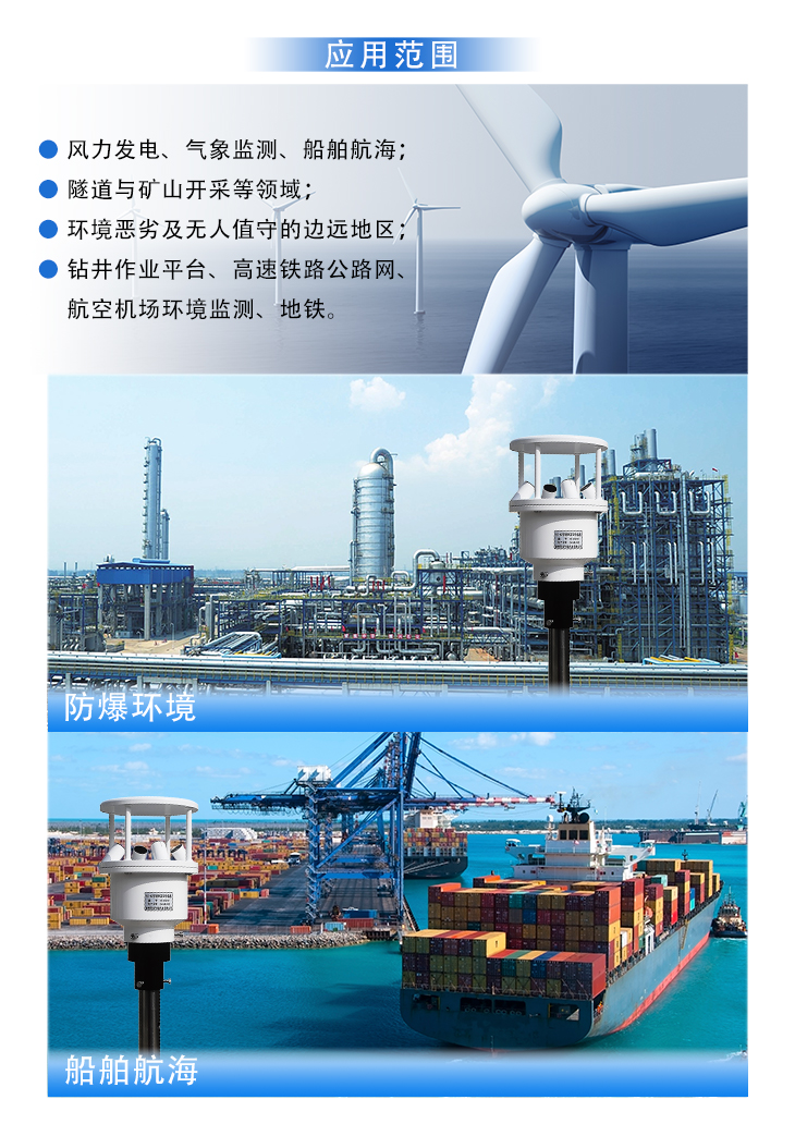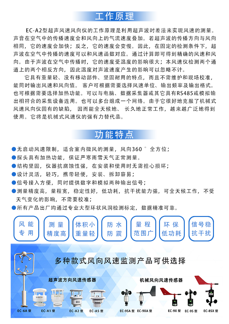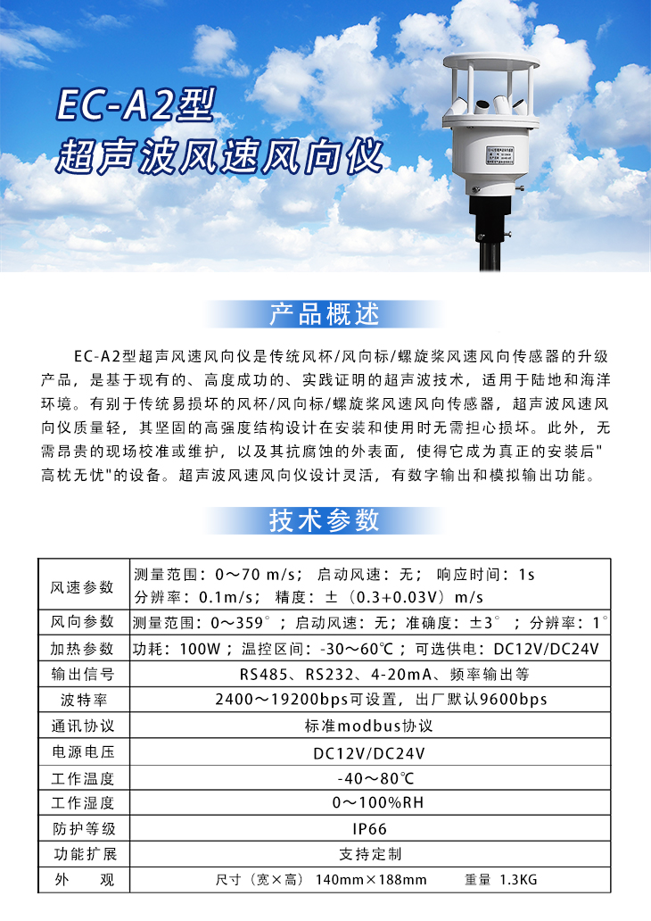 EC-A2型超聲風速風向儀是傳統風杯/風向標/螺旋槳風速風向傳感器的升級產品,是基于現有的、高度成功的、實踐證明的超聲波技術,適用于陸地和海洋環境。有別于傳統易損壞的風杯/風向標/螺旋槳風速風向傳感器,超聲波風速風向儀質量輕,其堅固的高強度結構設計在安裝和使用時無需擔心損壞。此外,無需昂貴的現場校準或維護,以及其抗腐蝕的外表面,使得它成為真正的安裝后"高枕無憂"的設備。超聲波風速風向儀設計靈活,有數字輸出和模擬輸出功能。