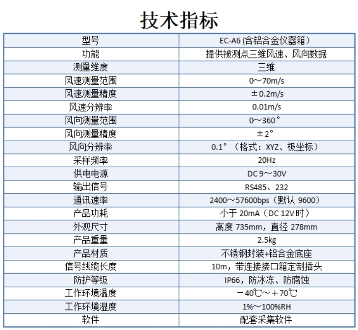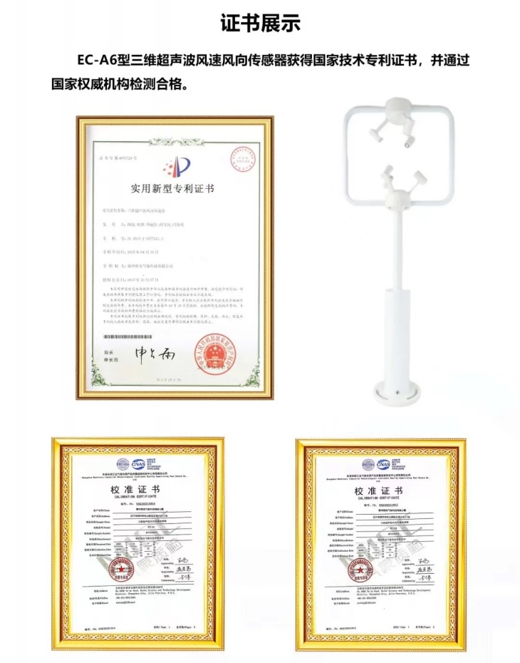 EC-A6型三維超聲波風速風向傳感器采用先進的超聲波測量技術,獨特的兩根支撐桿結構設計,大大減小了風阻的影響,提升了測量的精度。它具有全金屬材質,沒有任何移動部件,堅固耐用的特點,可以同時測量水平和垂直方向的風向, X/Y/Z軸風速(即U、V、W矢量輸出),聲溫、聲速等參數。適應在各種環境下,全天候、長久的正常工作,為各領域的氣象監測提供可靠數據。三維超聲波風向風速傳感器用來測量近地風向、風速。廣泛應用于城市環境監測、風力發電、氣象監測、橋梁隧道、航海船舶、航空機場等領域。