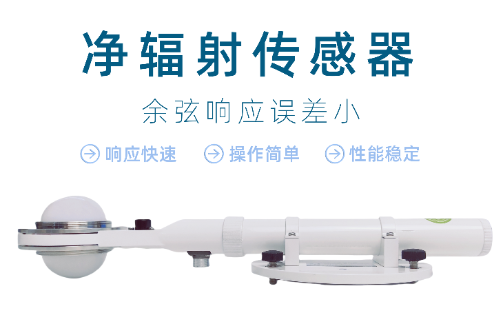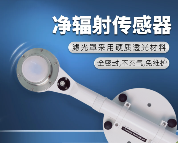 凈輻射表用來測量太陽輻射及地面輻射的凈差值。測量范圍為0.28~3μm的短波輻射和3~50μm的地球輻射。該傳感器的工作原理為熱電效應原理,感應部分是由康銅絲鍍銅組成的熱電堆,熱電堆的上下兩個面緊貼著涂有無光黑漆的感應面,兩個熱電堆分別接收太陽輻射和大地輻射。由于上下感應面吸收輻照度不同,使得熱電堆兩端產生溫度差異,其輸出電動勢與感應面接收的輻照度差值成正比。凈輻射為正值表示地表增熱,凈輻射為負值表示地表損失熱量。廣泛應用于農業氣象、土壤水分蒸發蒸騰損失總量計算、農作物災害預防及熱平衡相關的建筑機理研究。