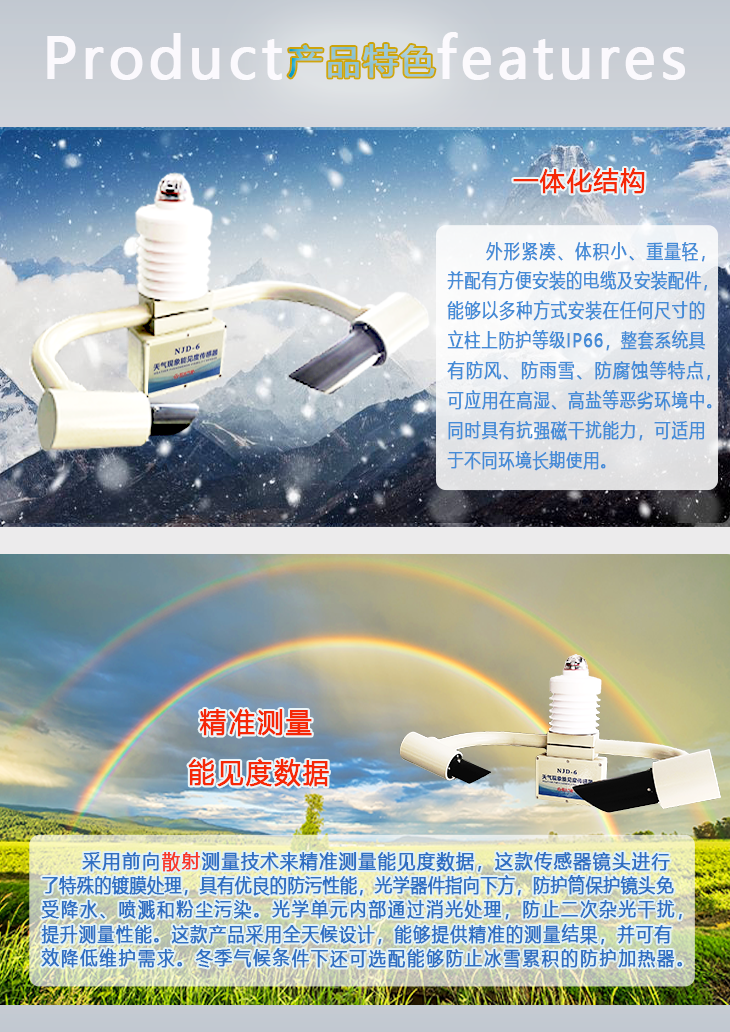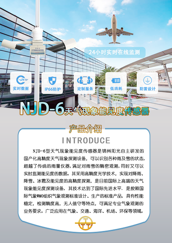 NJD-6型天氣現象能見度傳感器是錦州陽光自主研發的國產化高精度天氣現象探測設備,可以識別各種雨及雪的狀態,超越了傳統的雨量儀器,滿足對雨雪的精密觀測,同時又可以實時監測能見度的數據。